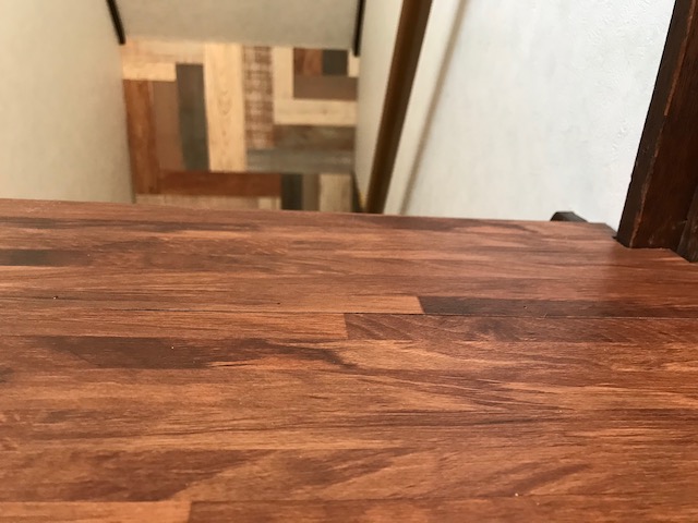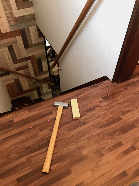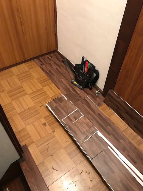 【埼玉ボロ家】フロアタイルが浮いてくる後回しになっていた階段上の通路に、余っていたフロアタイルシートを貼りました。