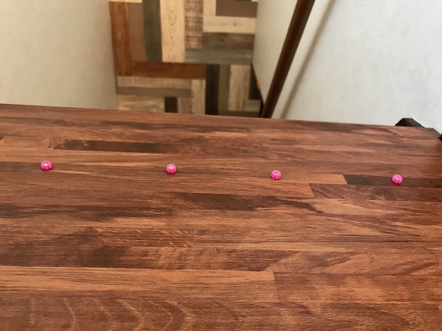 隠し釘を打ち付けた後。ピンクの頭が可愛い。