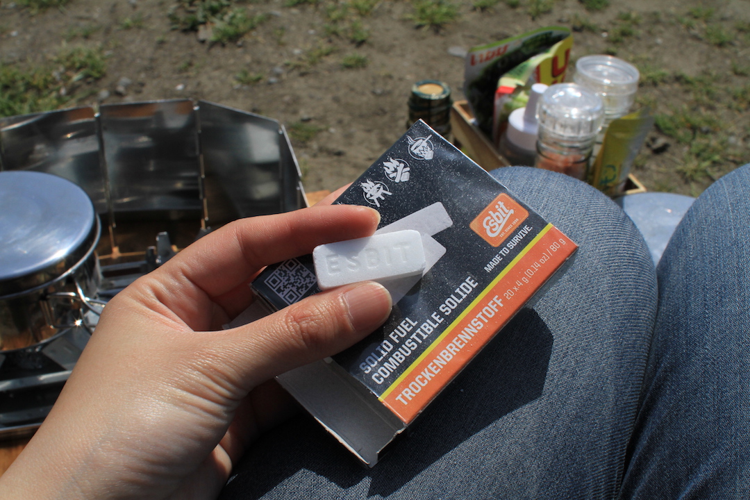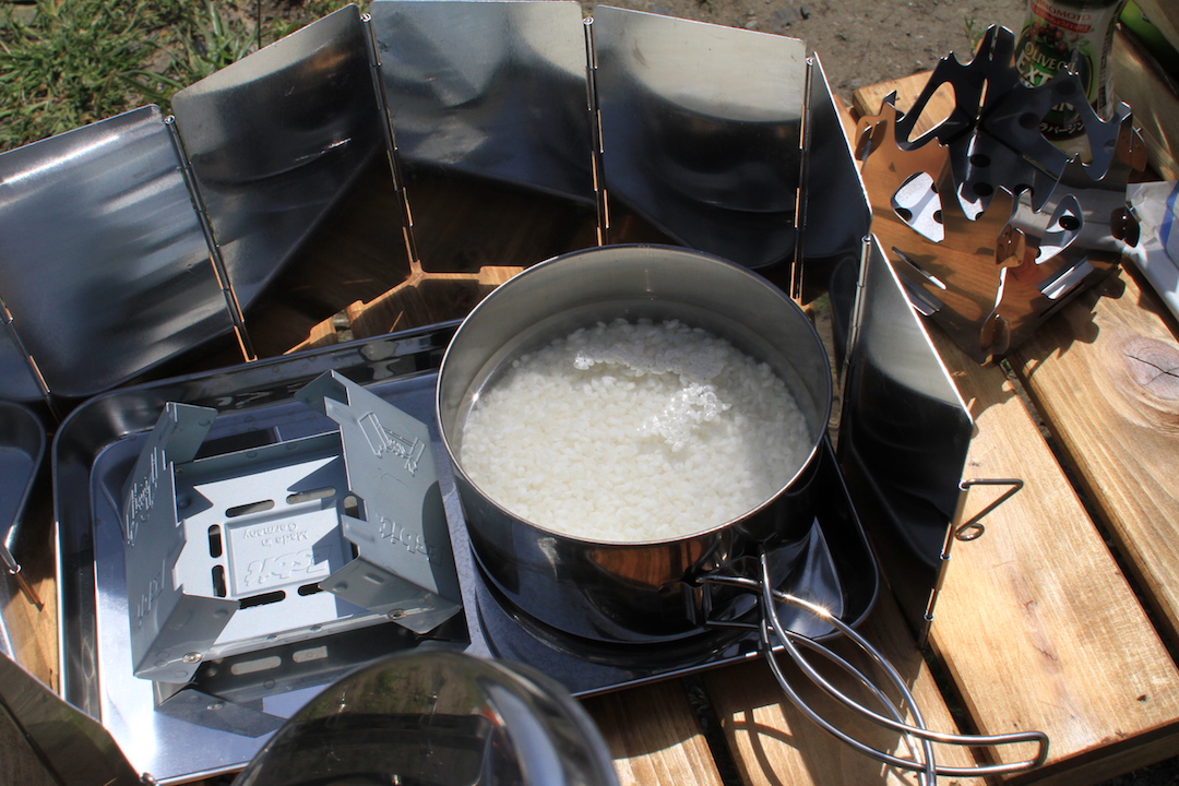 これは小さくて5分しか持たないので、100均で売ってた固形燃料で炊くことにしました。