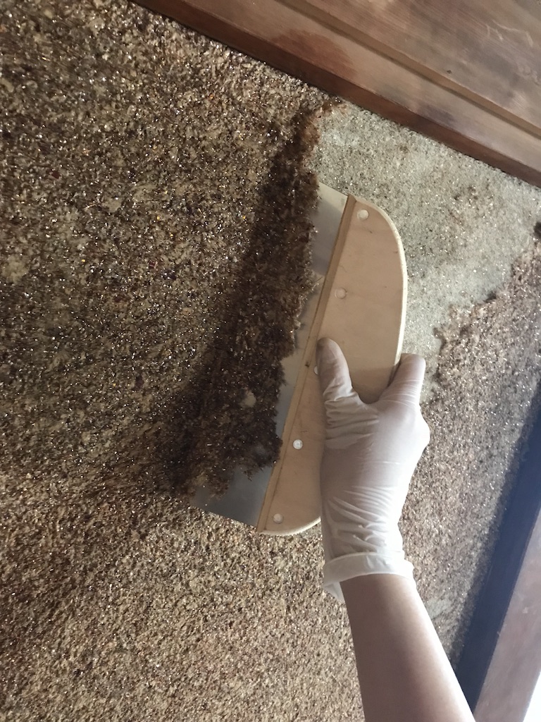 ネットで剥がし方を調べると、壁に水をかけてからヘラでこそぎ落とすらしいです。